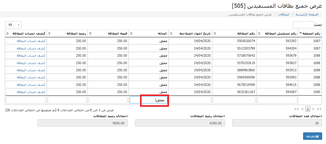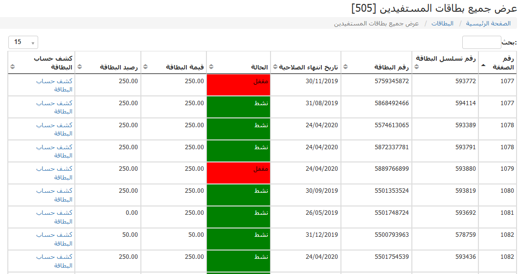 من خلال هذه الشاشة نستطيع أن نقوم بعملية عرض جميع البطاقات الموجودة لدي وتبين حالة كل بطاقة