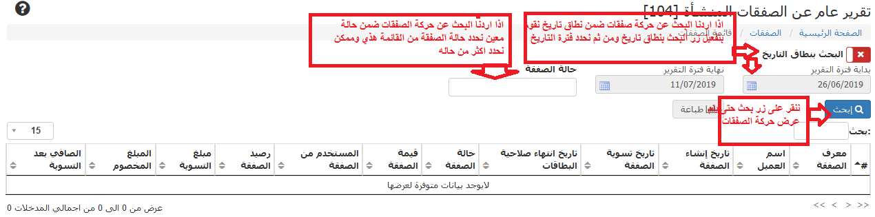 من خلال هذه الشاشة التي يقدما نظام مواسم يستطيع المنفذ أن يقوم بعملية عرض حركة جميع الصفقات التي قام بها خلال فترة معينة .