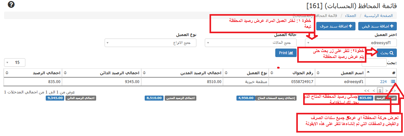 3. من القائمة المنسدلة العملاء نختر العميل المراد عرض رصيد المحفظة تبعة