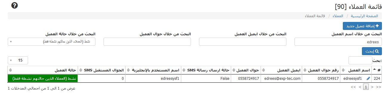 4-من خلال إحدى معايير البحث نكتب بيان البحث ونضغط زر البحث . أو نضغط مباشر على زر البحث لجلب جميع بيانات العملاء .