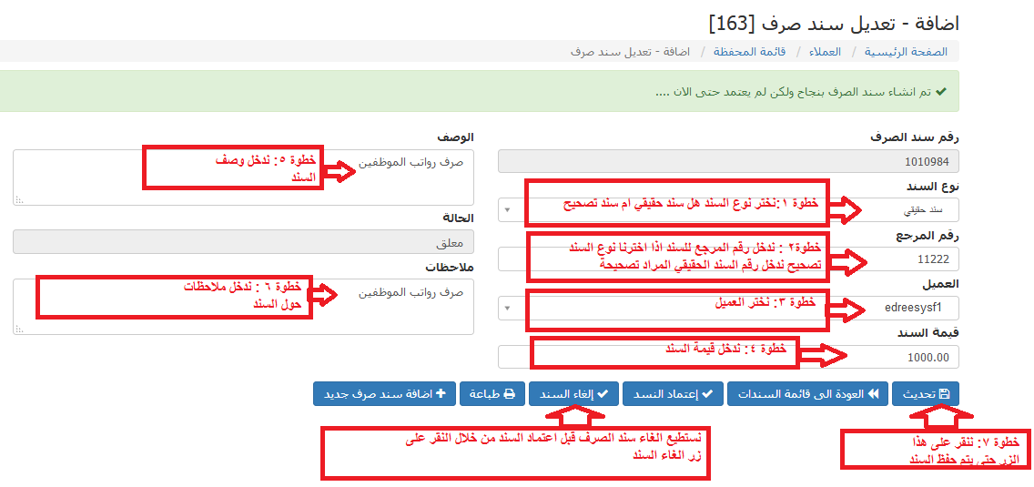 10.سوف تعرض رسالة تبين نجاح عملية إنشاء سند الصرف